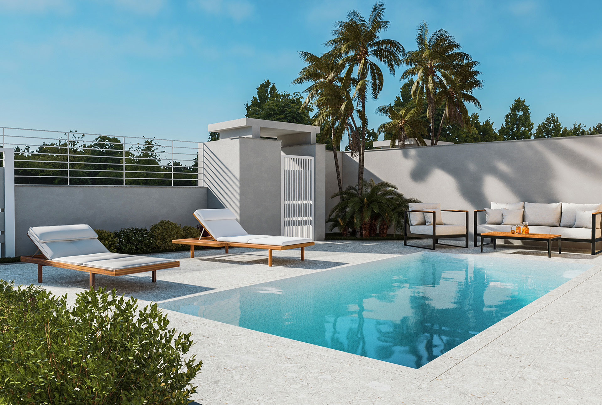 Una giustapposizione ordinata e armoniosa di forme semplici sottolineata da linee luminose che incorniciano logge e giardini, senza però complicare